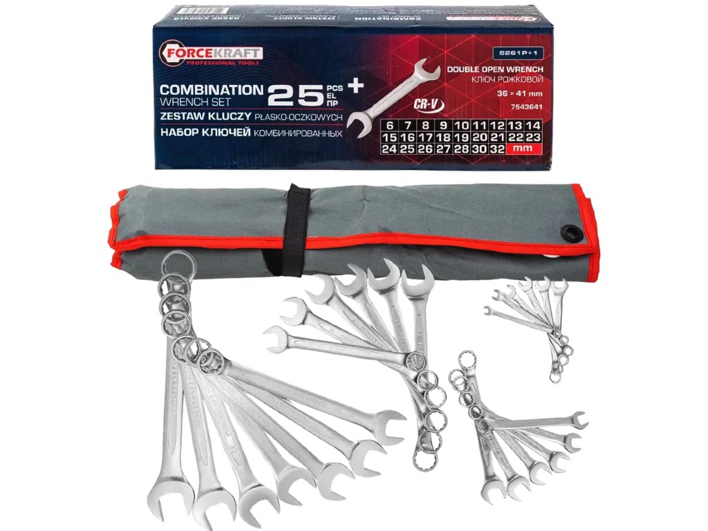 FORCEKRAFT Lapos villáskulcs készlet, 25 darabos, 6–32 mm, vászontokban