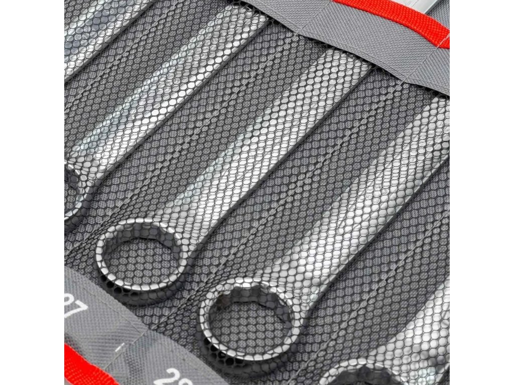 A teljes készlet egy vászon rendezőben található, rögzítőfuratokkal, így a villáskulcsok a műhely falára akaszthatók. Így minden szerszám rendezett és könnyen hozzáférhető.