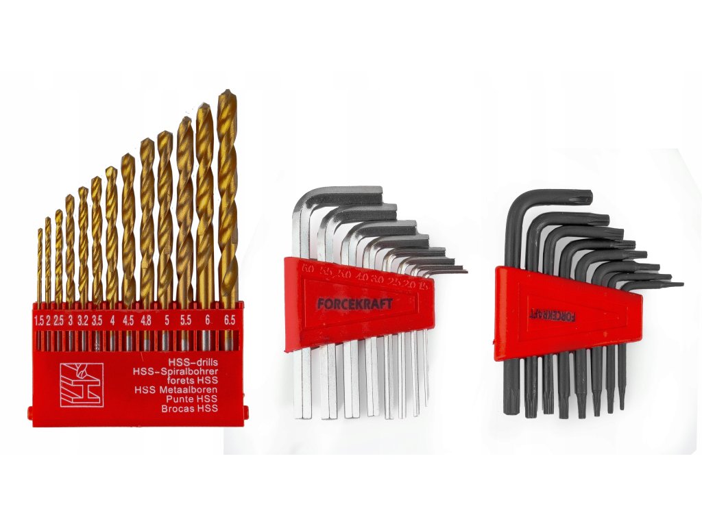 - Bitkészletek: PH, PZ, SL, HEX, TORX
