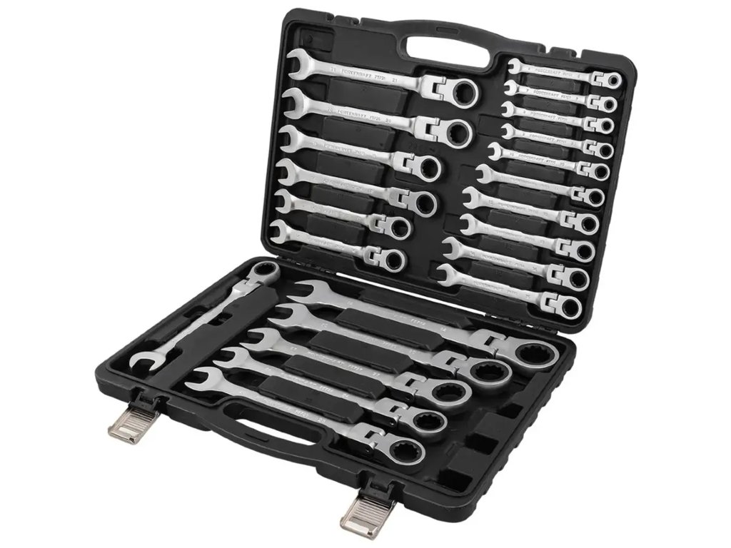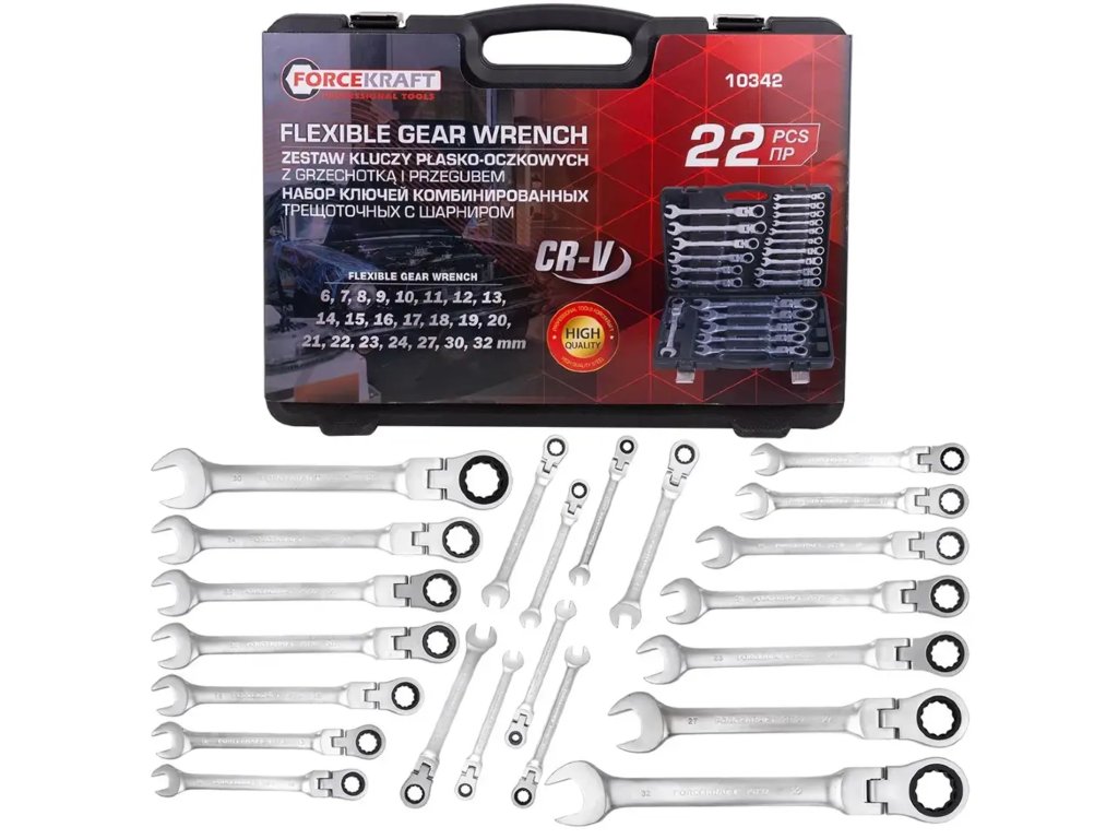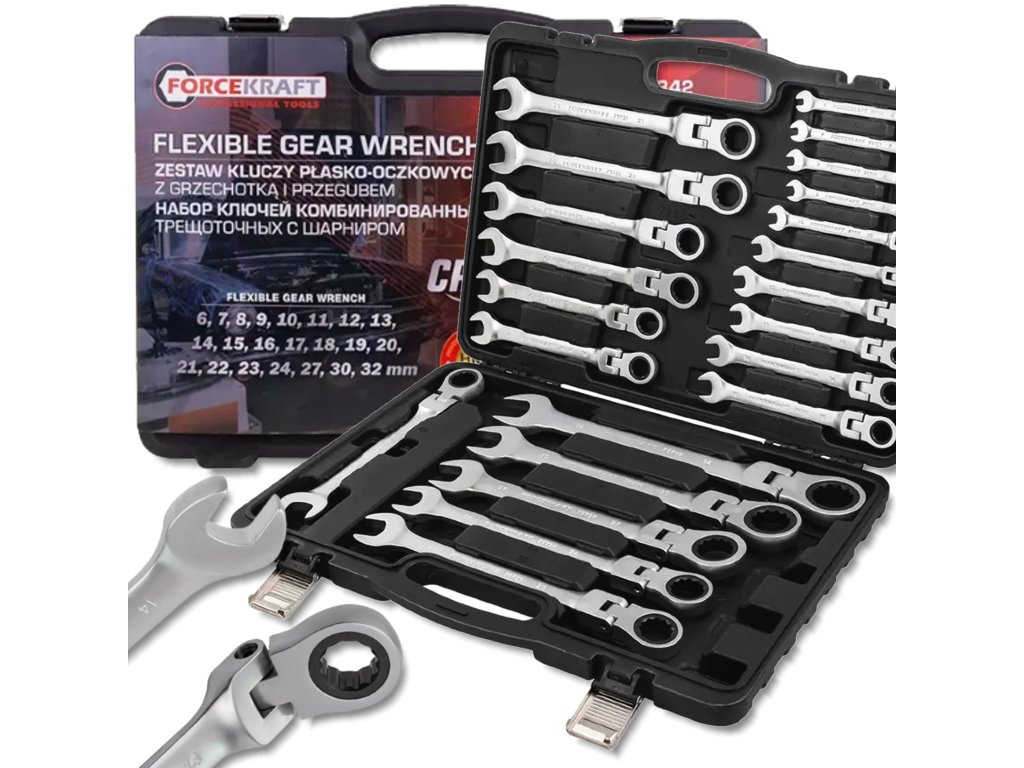 A Forcekraft professzionális csillag-villáskulcs készlet csuklóval és racsnival ideális megoldás szerelők, szerviztechnikusok és igényes barkácsolók számára, akik minőséget, tartósságot és kényelmes munkavégzést várnak el. A racsni, a mozgatható csukló és a króm-vanádium acél (Cr-V) precíz megmunkálásának kombinációjának köszönhetően ez a készlet alkalmas mind autójavító műhelyek, mind rendszeres javítási vagy szerelési munkák és telepítések számára.