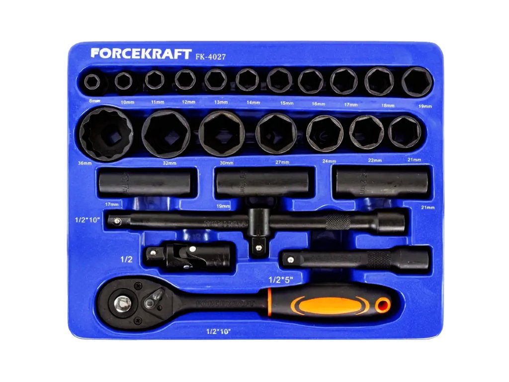 Olyan szerszámkészletet keres, amely még a legigényesebb műhelyi munkákat is képes kezelni? A Forcekraft FK-4027 egy komplett 1/2”-os ütvecsavarhúzó dugókulcs készlet , amely professzionális felhasználóknak és intenzív használatra készült álló és mobil műhelyekben.