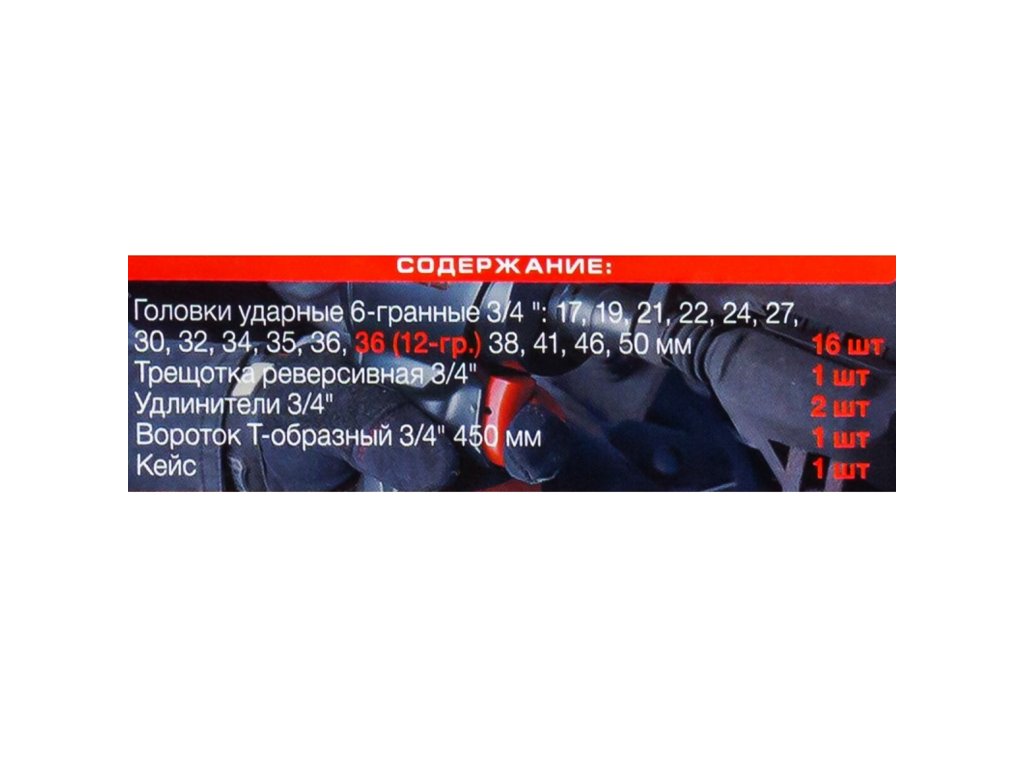 - 3/4"-os 12 pontos dugókulcsok – 16 db: 17, 19, 21, 22, 24, 27, 30, 32, 34, 35, 36 (x2), 38, 41, 46, 50 mm-es méretek