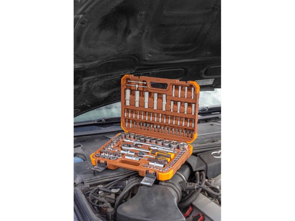 108 darabos szerszámkészlet tokban. A készlet nagyon hasznos a profi szerelők számára, valamint a legtöbb otthoni javításhoz. A szerszám kiváló minőségű króm-vanádium acélból készült, és a legszükségesebb szerszámokat tartalmazza a különféle autójavításokhoz, beleértve a gyújtógyertyákkal, fékekkel és motorkarbantartással kapcsolatos munkákat. A legtöbb mechanikai munkához használható, beleértve az olajcserét és az általános járműkarbantartást .