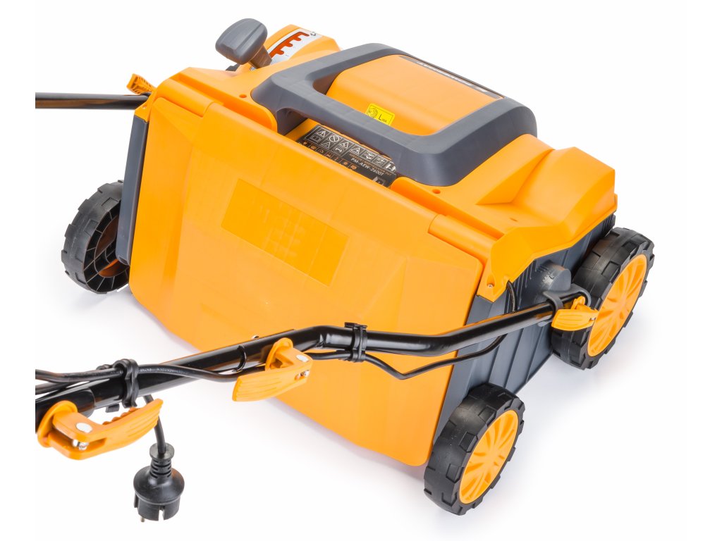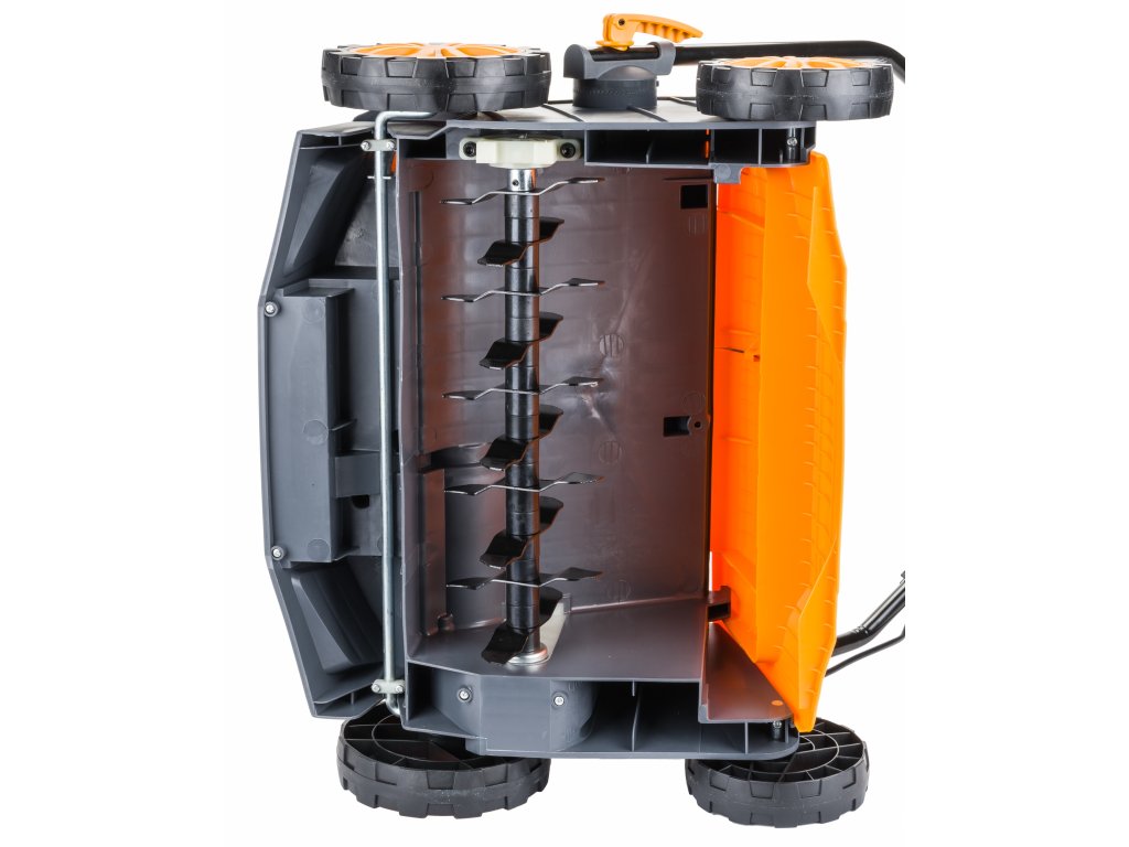 A nagy hátsó kerekek (180mm) és a kisebb első kerekek (100mm) miatt az aerátor könnyen kezelhető, ami kényelmes és hatékony munkát biztosít. A könnyű súly (12,8 kg) pedig megkönnyíti az eszköz szállítását és tárolását.