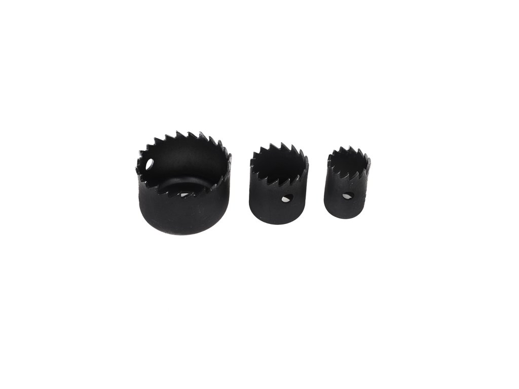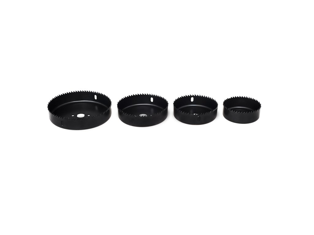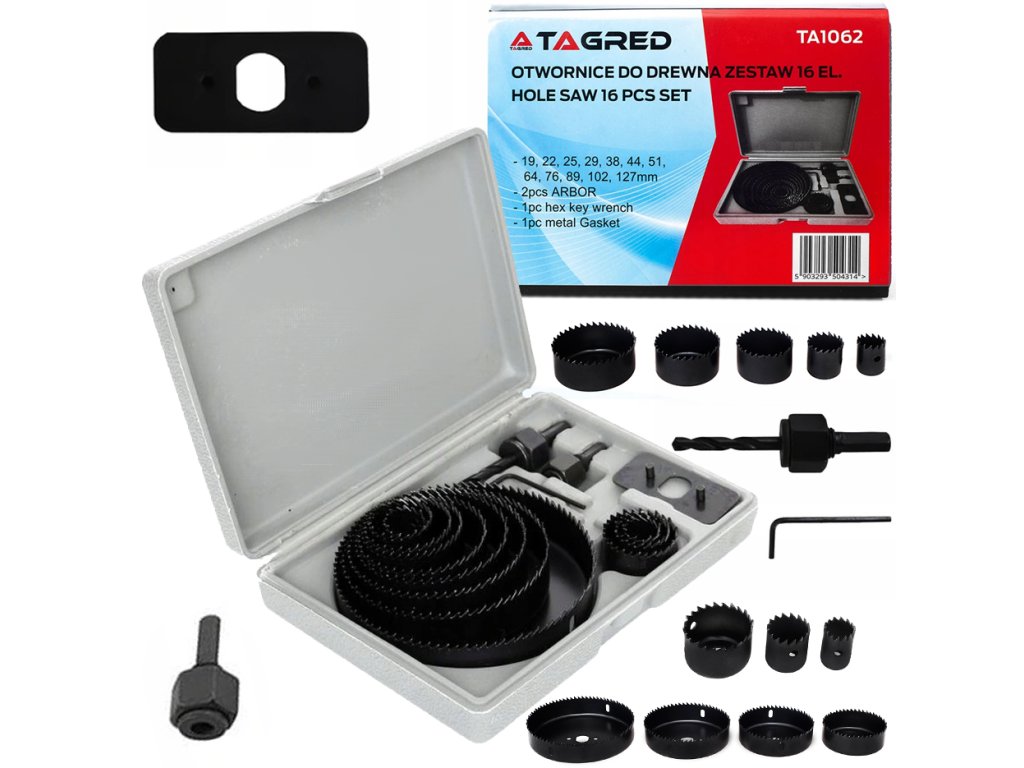 Fúrókorona készlet fához - 16 db 19-127 mm átmérőjű fúróval ideális választás fa, gipszkarton és kartonlemez lyukasztásához. Ez a készlet elengedhetetlen a kivitelezési munkák, valamint hidraulikus és elektromos installációk során. A fúrók lehetővé teszik a nagy átmérőjű lyukak kivágását, miközben a vágás csupán a kialakítás alatt álló lyuk peremén történik. A fúrók hengeres alakúak, éles vágóéllel a végükön, és edzett szerszámacélból készültek, ami biztosítja hosszú élettartamukat és hatékonyságukat.