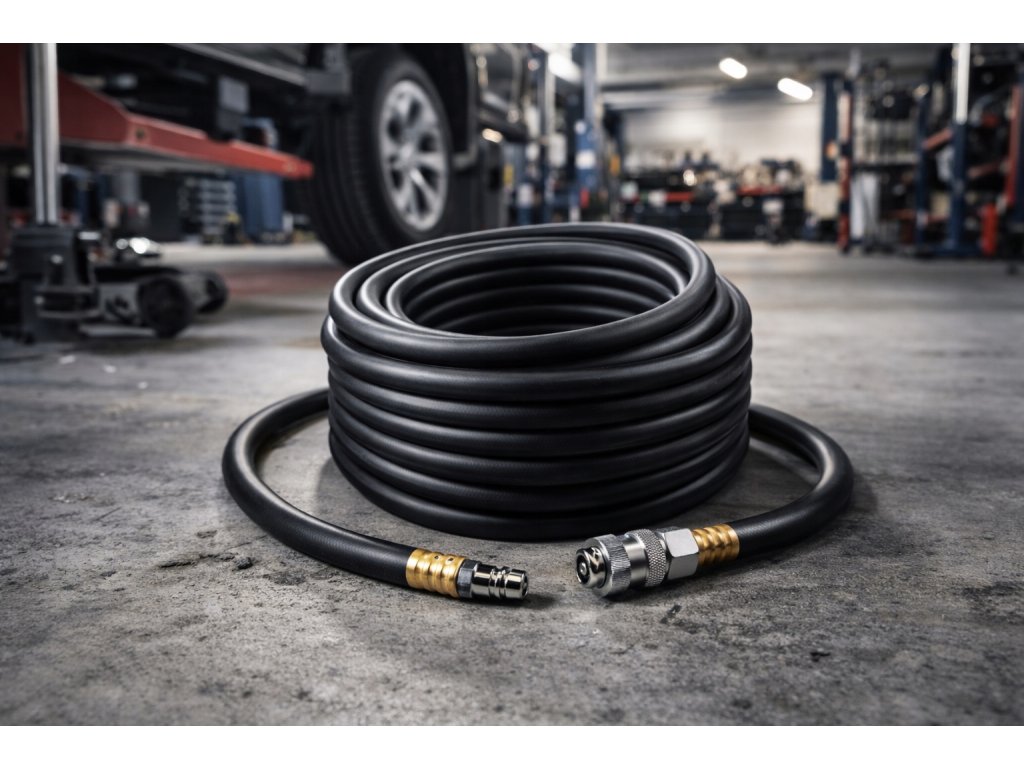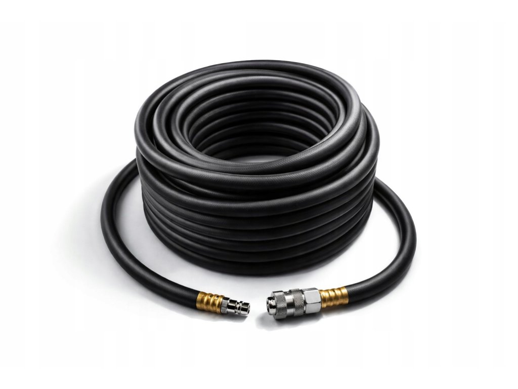 A tömlő szabvány gyorscsatlakozókkal van felszerelve, amelyek gyors és kényelmes csatlakoztatást tesznek lehetővé a szerszámhoz és a kompresszorhoz. A rugalmas kialakítás korlátozza a tömlő csavarodását és összegabalyodását, ami jelentősen növeli a munkavégzés kényelmét. Akár 20 bar-os magas nyomásállóságának köszönhetően különféle típusú pneumatikus szerszámokkal való igényesebb használatra is alkalmas.