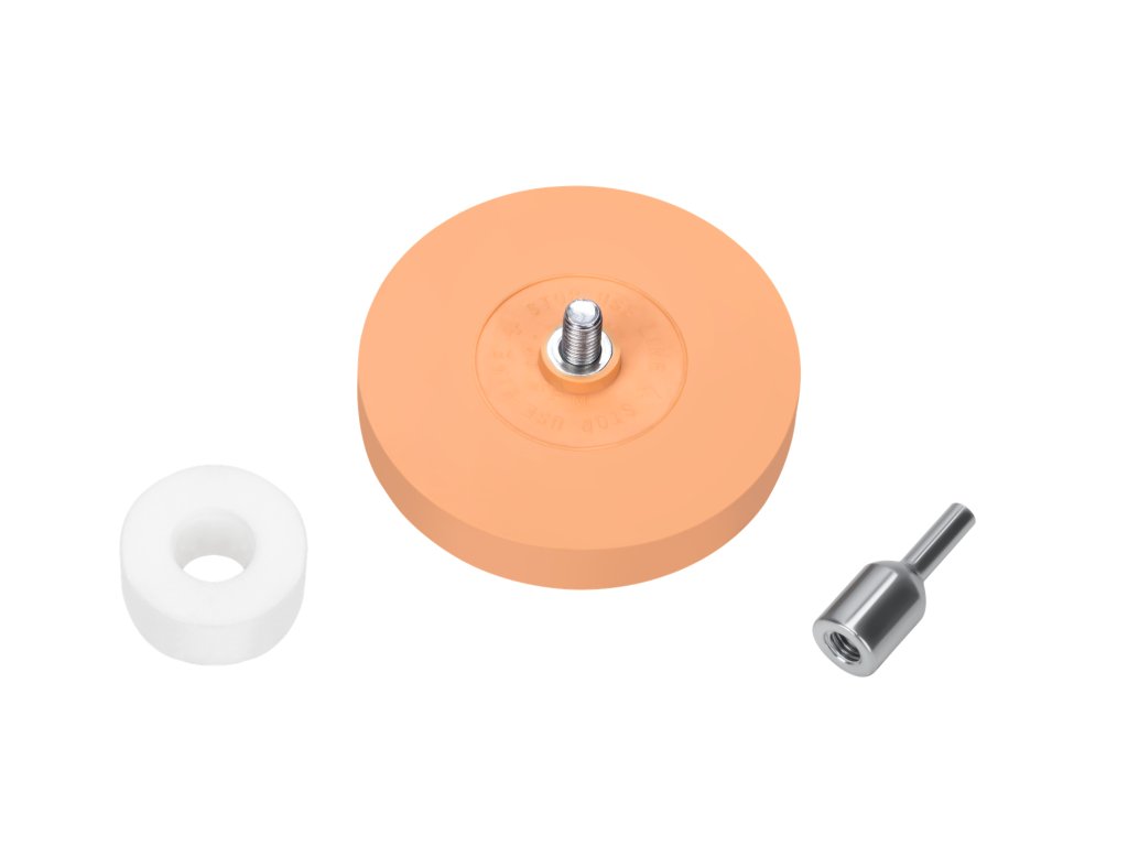 A tárcsa forog, és finoman eltávolítja a ragasztómaradványokat, a szalagokat és a matricákat.