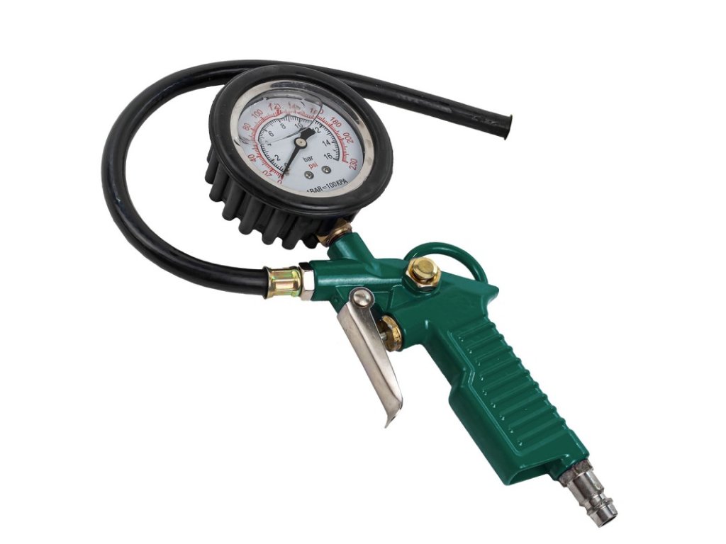 Az analóg nyomásmérővel és 0-16 bar-os tömlővel ellátott gumiabroncs-felfújó pisztoly praktikus eszköz autók, motorkerékpárok és egyéb járművek gumiabroncsainak felfújásához.