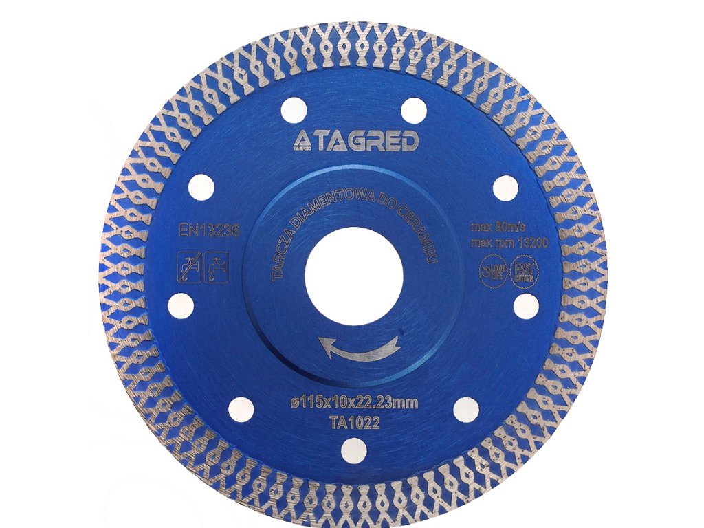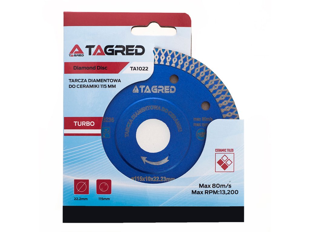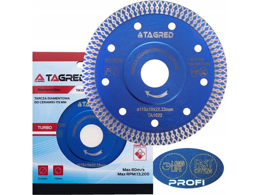 Professzionális LONG LIFE gyémánt vágótárcsa a TAGRED márkától, amely a tartós vágásra lett kifejlesztve gránit, márvány, kerámia és terakotta anyagokhoz. Kompatibilis a szárazon működő kézi csiszológépekkel, és 22,23 mm átmérőjű rögzítéssel rendelkezik. Ez a tárcsa a magas munkakultúrájával kiemelkedik, amely gyors és pontos vágást biztosít minden gránit típushoz.