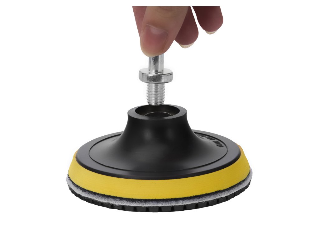 Menetes rögzítőkorong + M12 adapter – Közvetlen csatlakoztathatóság szögcsiszolóra, polírozóra, vagy adapterrel fúróra/csavarhúzóra. Ajánlott olyan gépek használata, amelyek rendelkeznek fordulatszám-szabályzással.