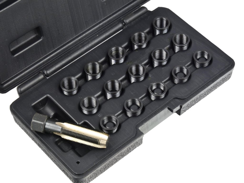 Professzionális 16 darabos gyújtógyertya menetsérülés javító készlet mindent tartalmaz, amire szüksége van a M14 x 1,25 méretű menetek javításához.