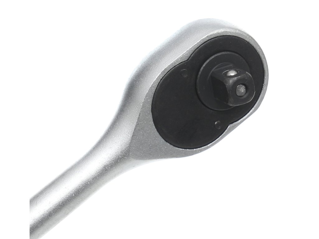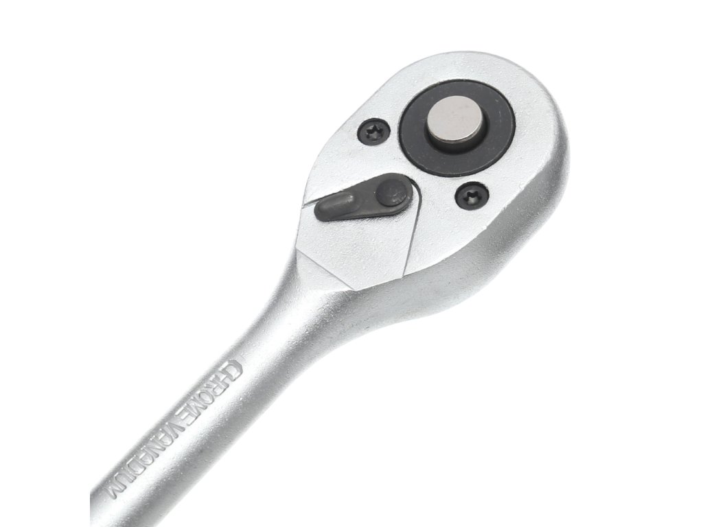 Pevná ráccs 3/8" racsnis kulcs, amely kiváló króm-vanádium acélból (CrV) készült, garantálja a maximális tartósságot és a kitűnő védelmet a károsodás ellen. Ez a dugókulcs 24 erős foggal rendelkező mechanizmussal lett tervezve, amely hatékonyan továbbítja a nagy nyomatékot a négyzetes meghajtóra. Ezen kívül tartalmaz egy irányváltó kapcsolót a fején és egy gombot az egyszerű végződések kioldásához.