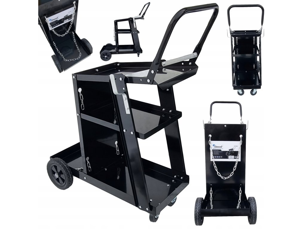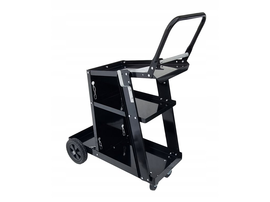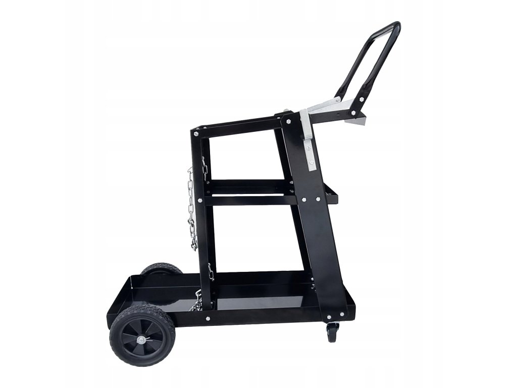 A kocsi négy kerékkel van felszerelve - két nagyobb fix kerék hátul a stabilitás érdekében, és két forgókerék elöl a könnyű manőverezés érdekében. Az ergonomikus kialakítású fogantyú kényelmes irányítást tesz lehetővé, akár egy profi, akár egy hobbi hegesztő műhelyében.