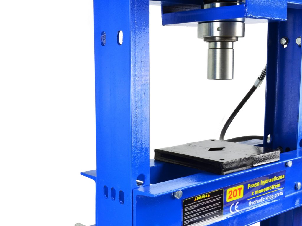 20 tonna kapacitású hidraulikus prés, ideális használatra műhelyekben, szerviz központokban, ipari vállalkozásoknál, valamint mezőgazdaságban. Ez a prés kiegészítő megerősített kerettel van ellátva, amely nagy mechanikai sérülésekkel szembeni ellenállást biztosít.