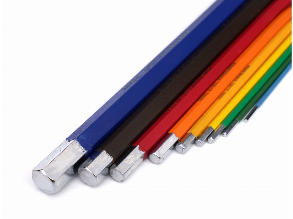 Kiváló minőségű CRV acélból készült, amely nagy szilárdságáról és rugalmasságáról ismert. Az imbuszkulcsok keménysége 48-52 HRC, ami hosszú távú használatot garantál. A kulcsok színkódolása megkönnyíti a megfelelő méret kiválasztását.