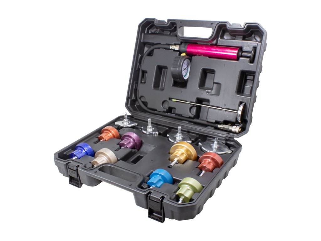 A készlet személygépkocsik, furgonok és teherautók hűtő- és fűtésrendszerének tömítettségének ellenőrzésére és vizsgálatára szolgál.