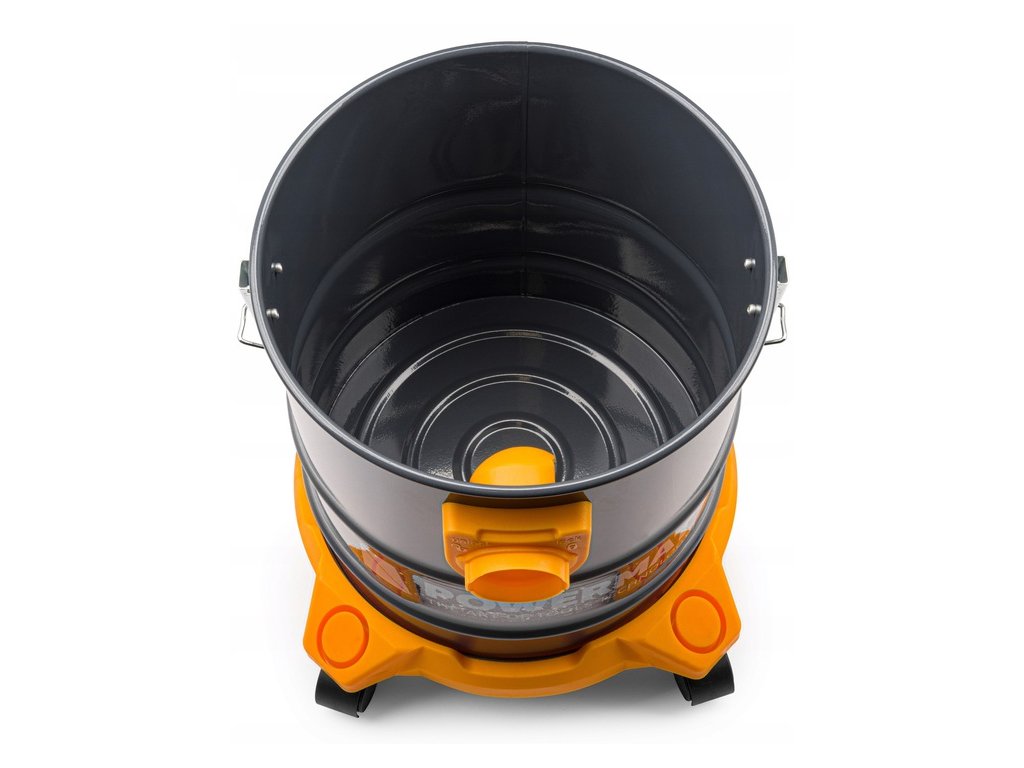 A tűzálló rozsdamentes acél tartály űrtartalma 20 L, amely lehetővé teszi a kényelmes munkát anélkül, hogy gyakran kellene kiüríteni a hamut. A tartály nagy űrtartalma miatt ez a készülék ideális ipari porszívóként való használatra.