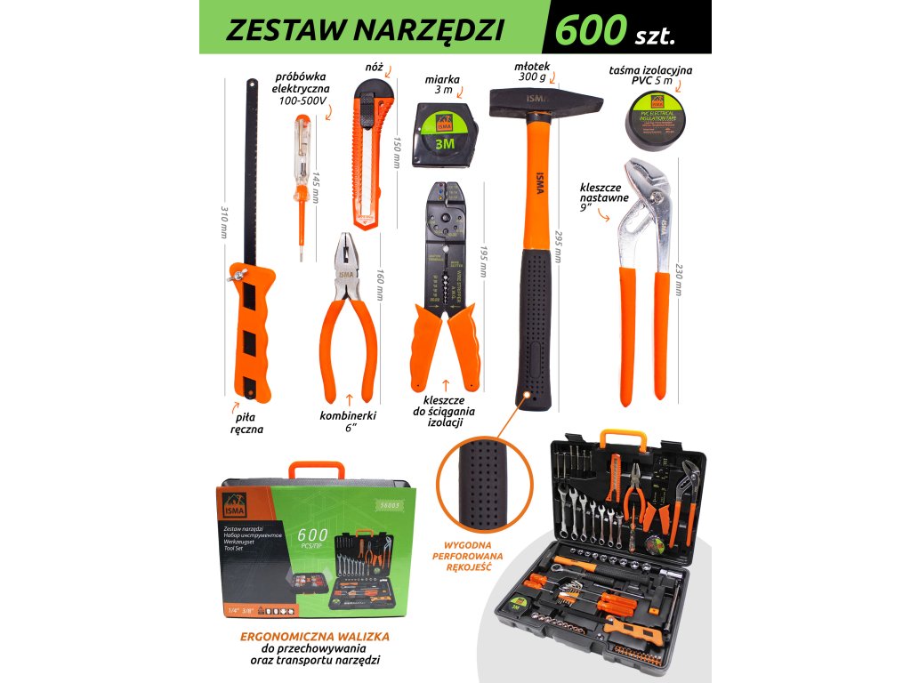 ISMA szerszámkészlet 600 darabos, villáskulcsok, csavarhúzók, bitek