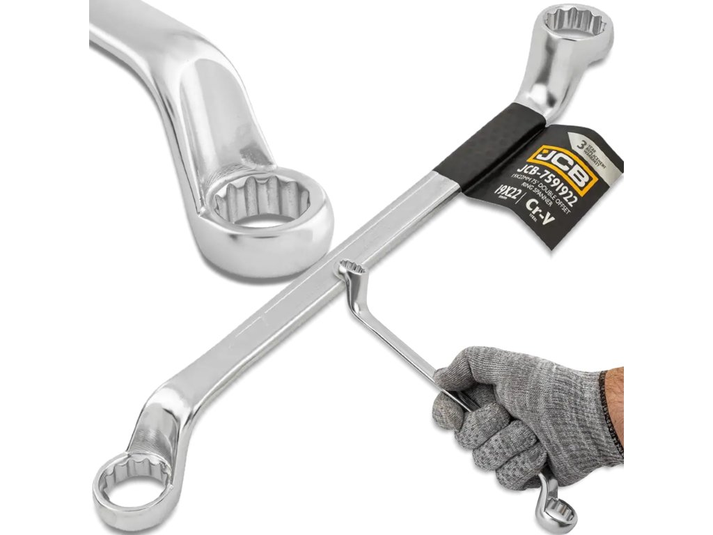 JCB kétvégű csillagkulcs, 75°-os szögben elfordított, 19x22 mm, Cr-V, 12 hegyű