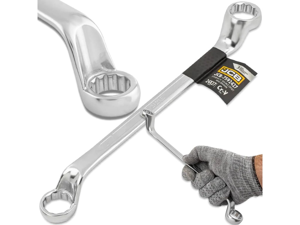 JCB kétvégű csillagkulcs, 75°-os szögben hajlított, 24×27 mm, Cr-V, 12 oldalú