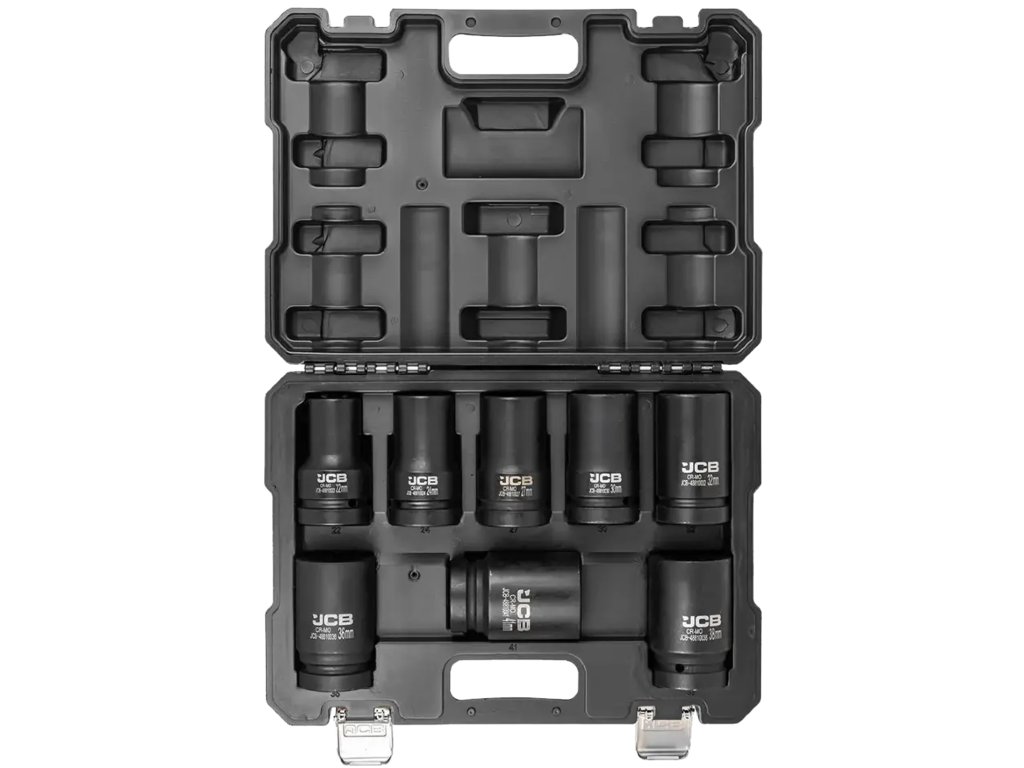 A JCB Tools 8 darabos mélyhúzó készlet egy professzionális szerszám, amelyet intenzív műhelymunkákhoz terveztek, beleértve a csavarok és anyák összeszerelését és szétszerelését ütveszerszámokkal.
