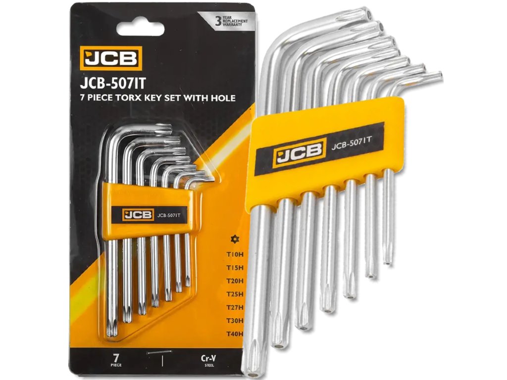 A JCB 7 darabos, lyukas TORX kulcskészlete (biztonsági TORX, H/TN típus) nélkülözhetetlen eszközök a manipuláció ellen biztosított elemekkel való munkához. A hegyben (a hegy közepén) található lyuknak köszönhetően a kulcsok lehetővé teszik speciális rögzítőcsavarok be- és kicsavarását, amelyeket például elektronikában, riasztórendszerekben, ipari automatizálásban, háztartási gépek szervizelésében és autókban használnak.