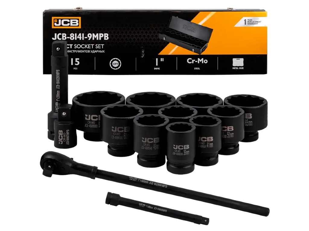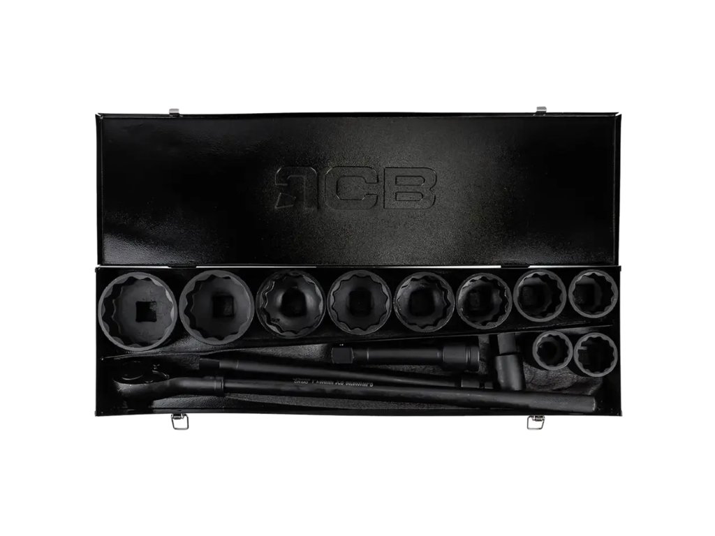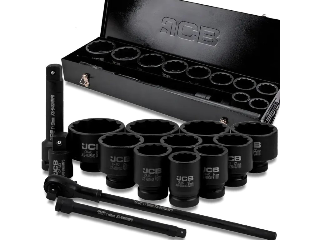 A JCB professzionális, 1"-os befogású dugókulcs készlet ideális szerszám nagy nyomatékkal végzett munkához. A 12 oldalú profilnak köszönhetően a fejek kiváló fogást biztosítanak még enyhén lekerekített csavaréleken is, ami növeli a biztonságot és a kényelmet munkavégzés közben.