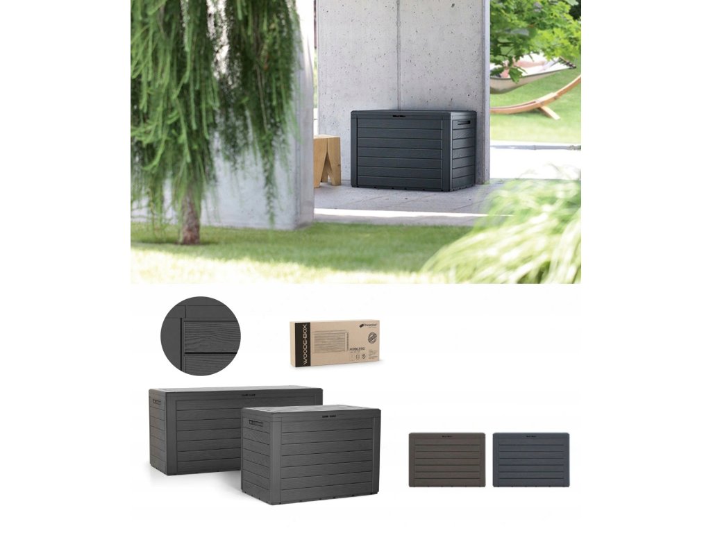 Praktikus kerti tároló doboz 190 liter térfogattal, amely tökéletes a kertészeti eszközök, párnák, öntözőcsövek és egyéb tárgyak tárolására. A doboz tartós műanyagból készült, fából készült deszkákra emlékeztető dizájnnal. Konstrukciójának köszönhetően védi a tárolt dolgokat a portól és az esőtől, így alkalmas használatra erkélyen, teraszon, kertben, garázsban vagy műhelyben.