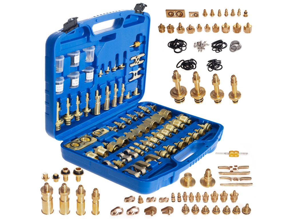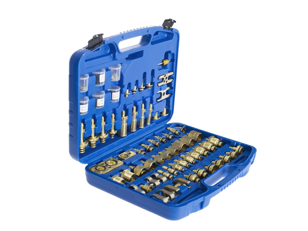 A 78 darabot tartalmazó szett számos kombinációs lehetőséget kínál az egyes rendszerkomponensek összekapcsolásához, mint például elpárologtató, kondenzátor és klímaberendezés tömlő.