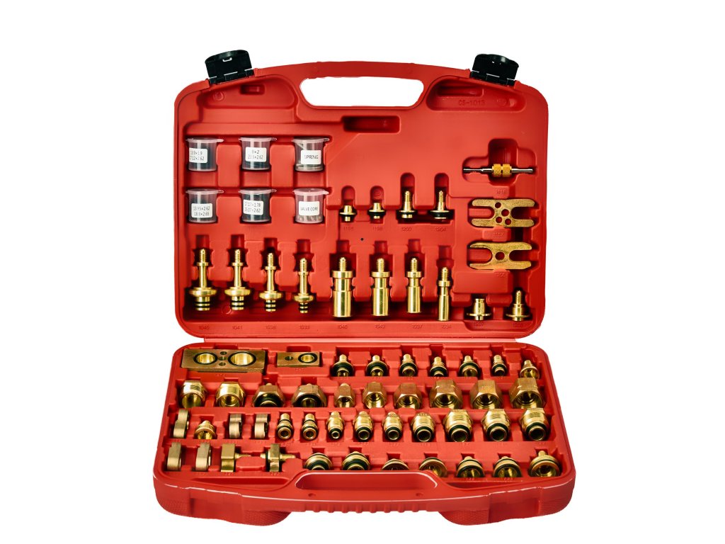 Professzionális adapterkészlet klímaöblítéshez a Kraft&Dele márkájú KD10063 modellhez, 78 alkatrészből áll. A készlet rendkívül univerzális, mert a piacon elérhető legtöbb márka számára kompatibilis.