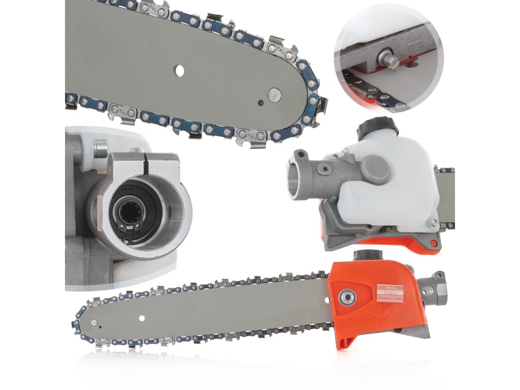 Láncfűrész – adapter benzinmotoros fűkaszához 28 mm 9 fogú G81064B lehetővé teszi, hogy egyszerűen és gyorsan átalakítsa a benzinmotoros fűszegélynyírót láncfűrésszé. Ez az eszköz tökéletesen alkalmas ágak és élő kertek vágására nehezen elérhető helyeken. Az adapter automata lánckenő rendszerrel van felszerelve, amely garantálja a termék megbízhatóságát.