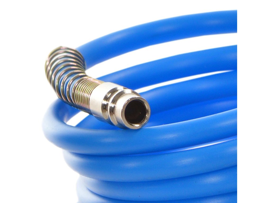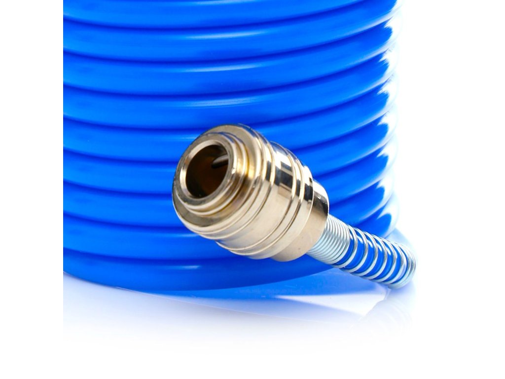 A tömlő gyorscsatlakozóval van felszerelve, amely lehetővé teszi a pneumatikus eszközökhöz való egyszerű és gyors csatlakoztatását. A tartóddásának és rugalmasságának köszönhetően mindennapi használatra és nehezebb körülmények között is alkalmas.