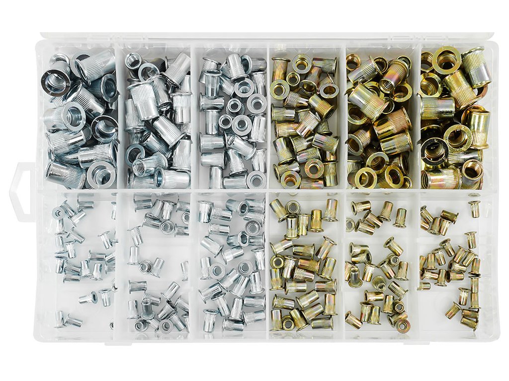 A csavaranyák lehetővé teszik a csavar vagy metrikus menetes csavar behajtását lemezbe vagy más anyagokba, ahol nem lehetséges menetet vágni. A kínált készlet 300 darab acél és alumínium csavaranyát tartalmaz, méretekben: M3, M4, M5, M6, M8, M10, mindegyikből 25 darabot. A csavaranyák hengeres peremmel rendelkeznek, amely bordázott, így szorosabb illeszkedést biztosít a beszerelt elemhez.