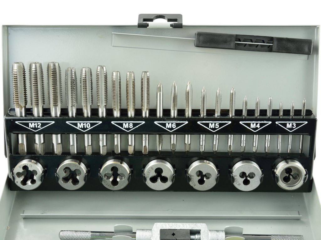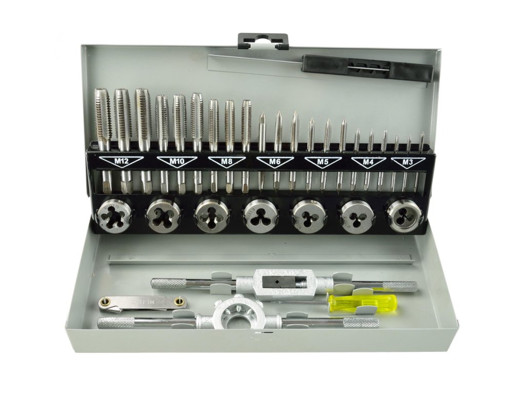 Modern M3 - M12 menetfúró és betétek készlet a precíz menetfúrás tökéletes eszköze. Ez a készlet 32 különböző szerszámot tartalmaz, amelyeket magas minőségű acélból készítettek.