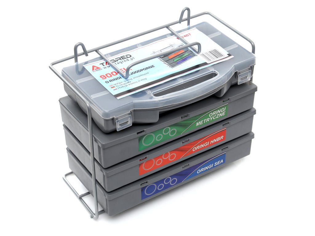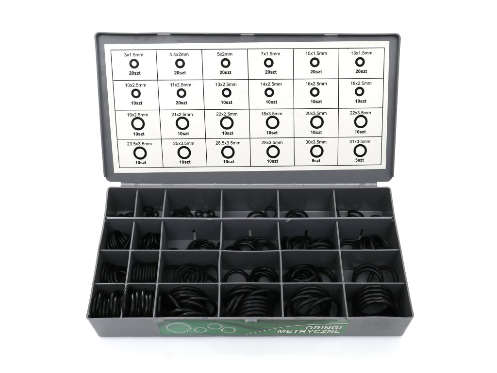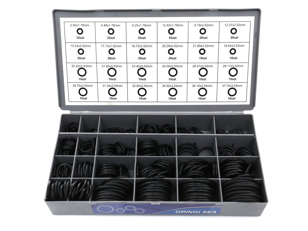 A készlet összesen 900 O-gyűrűt tartalmaz, amelyek gondosan rendezve találhatók a válogatóban: