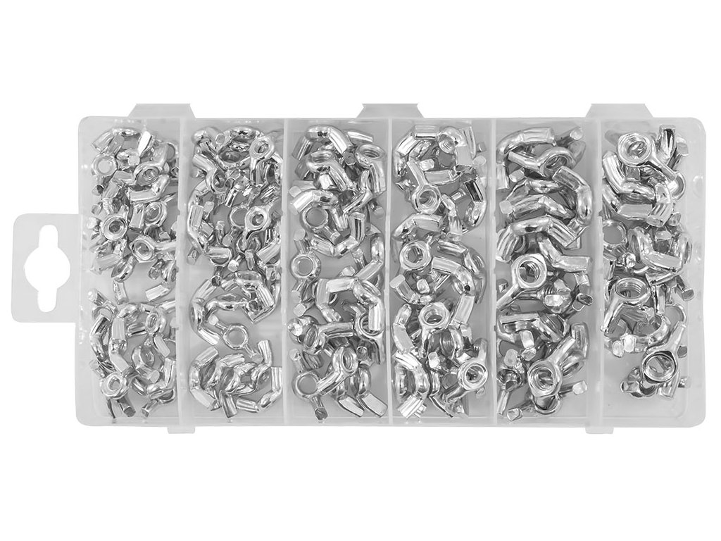 A készlet 150 darab metrikus pillangó anyát tartalmaz. Az anyák praktikus „szervező” csomagolásban találhatók.