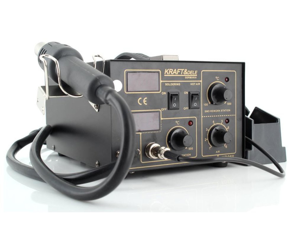 Műanyag hegesztőgép 2 az 1-ben KD850 Kraft&Dele egy nagyon hasznos készülék mindenki számára, aki gyorsan összekapcsolja a műanyag alkatrészeket. A készülék zökkenőmentesen szabályozható a hegy hőmérséklete, és a kifújt levegő erőssége és hőmérséklete is. Beépített automatikus hűtőrendszerrel rendelkezik a munka befejezése után, ami jelentősen meghosszabbítja a fűtőtest élettartamát. A forrasztóállomás LED kijelzővel rendelkezik, amely megjeleníti a forró levegő hőmérsékletét. A hőmérséklet és a teljesítmény szabályozása forgó gombokkal történik.