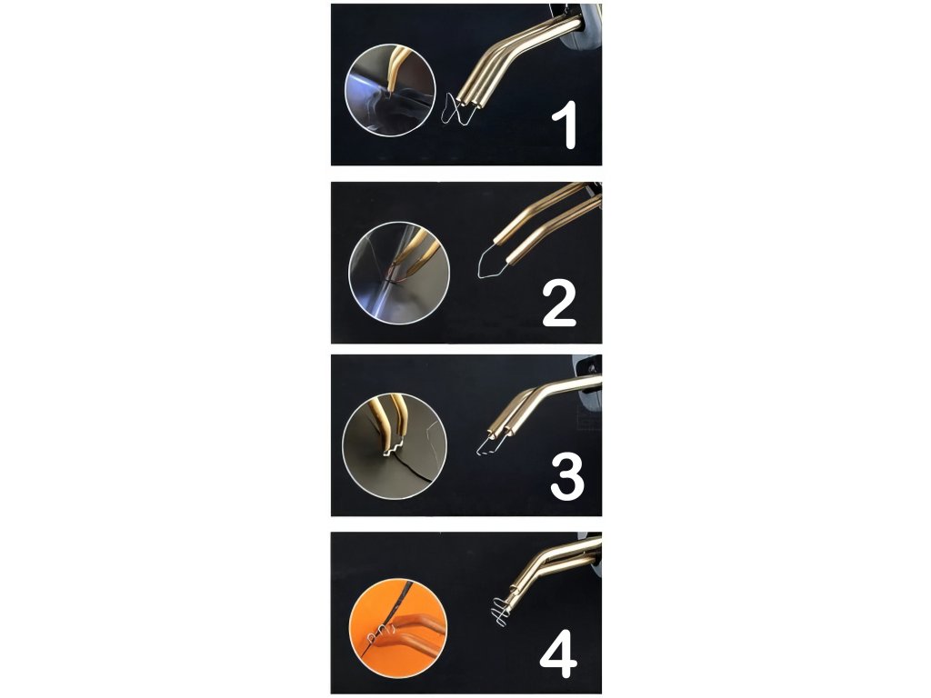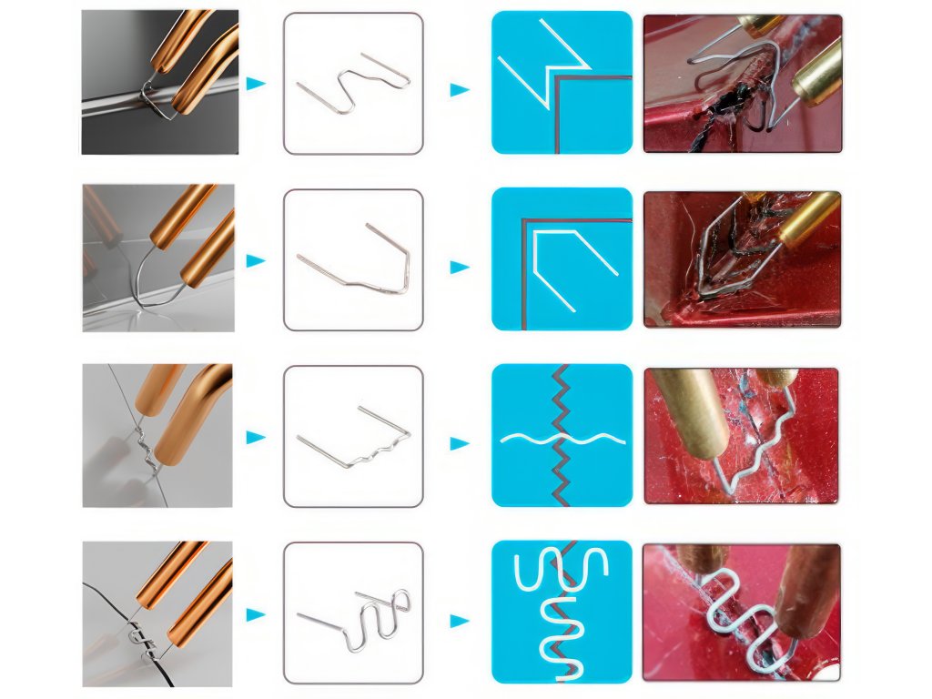 A hegyek formájának köszönhetően felületi hegesztéseket végezhet, amelyek összekapcsolják a repedéseket, vagy klipszként is használhatók. Helyezze a hegyet a repedés átlós részébe, majd távolítsa el a hegyet a hegesztőgép villáiból. Az anyag megszilárdulása után hajlítsa meg a kiemelkedő végeket úgy, hogy a hegesztés felületével egyszerre eltörjenek.