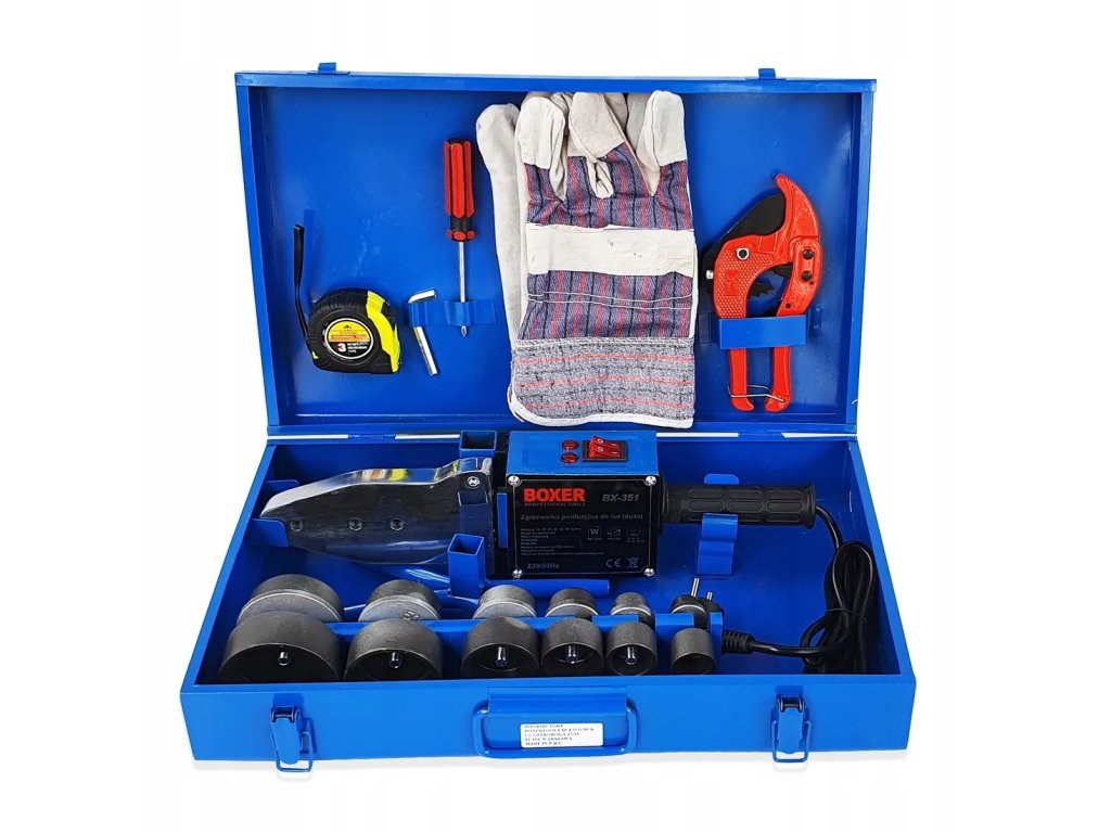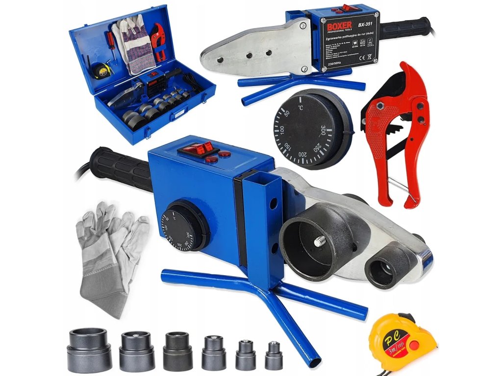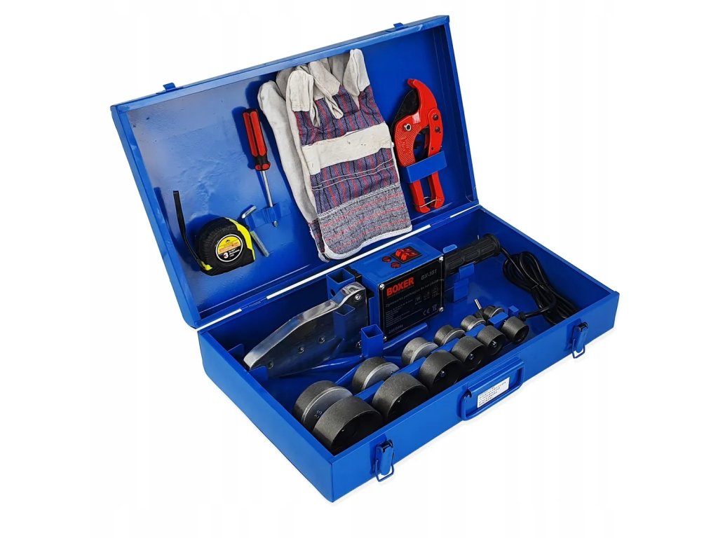 - A csomag tartalma: Hegesztőgép, 6 fej (20, 25, 32, 40, 50, 63 mm), imbuszkulcs, csavarhúzó, kesztyű, 3 m mérőszalag, kések, állvány, táska, használati utasítás