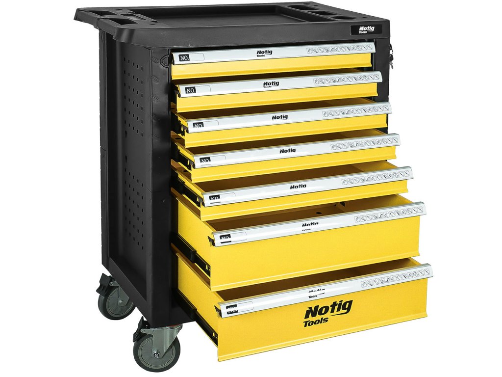 Polipropilén panel. Ergonomikus fogantyú, amely integrált a panelbe. Központi zár két kulccsal, amely az összes fiókot védi. 7 golyóscsapágyas, teljes kihúzású fiók. 2 fix és 2 forgó, 125 mm átmérőjű kerék, az egyik kerék fékkel felszerelt. Maximális terhelhetőség a panelen: 450 kg. Ütközésvédelem a szekrény mind a 4 sarkán.