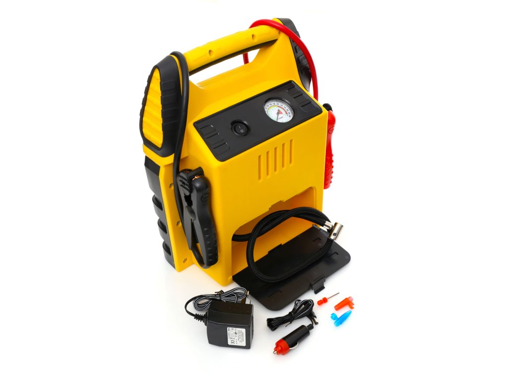 Multifunkciós indító készülék 5 az 1-ben - indítómotor, kompresszor, zseblámpa KD1921. Minden garázsban és autónál hasznos készülék. Ennek köszönhetően beindíthatod az autót, feltöltheted a telefont, megvilágíthatod az utat és felpumpálhatod a gumikat. Beépített indítókábellel rendelkezik 65 cm hosszúságban és a kompresszorhoz tartozó 55 cm hosszú tömlővel.