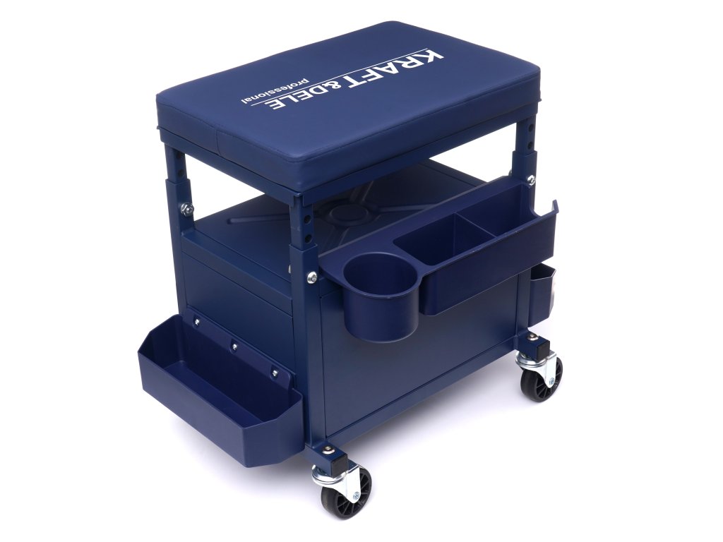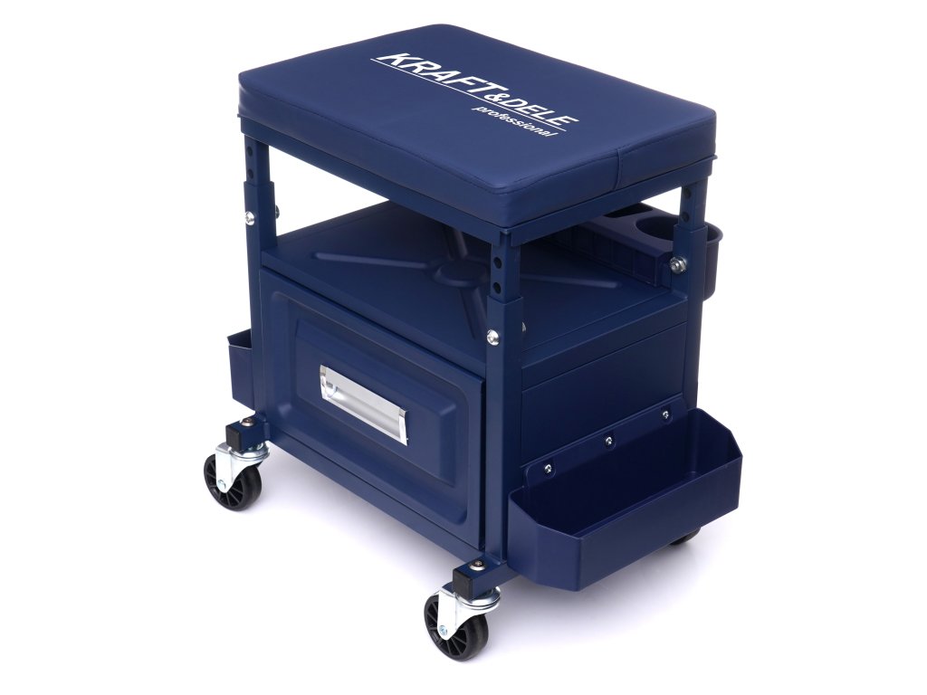 Munkaszék fiókkal KD10761 a Kraft&Dele márkájú műhelyszék professzionális műhelyekben, autószervizekben, javító műhelyekben és otthoni garázsban való használatra készült. Tágas fiókkal rendelkezik, teherbírása kb. 9 kg. Továbbá 3 polccal rendelkezik, amelyekre a munka közben használt szerszámok könnyen elhelyezhetők.