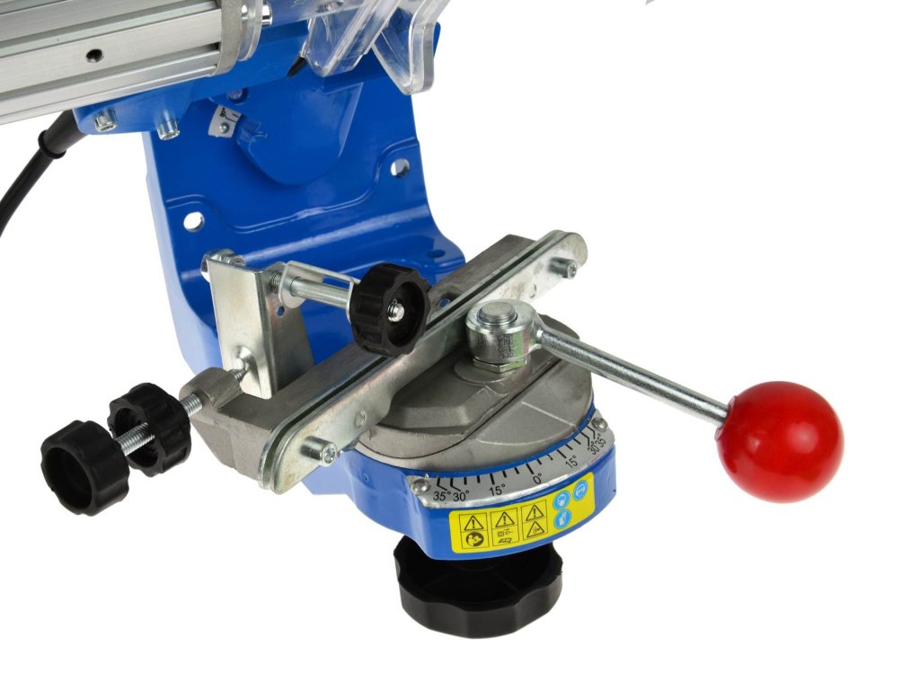 Az eszköz 230W teljesítményű indukciós motorral van felszerelve, amely hatékonyan hűtött levegő által. A 0 és 35° között állítható élezési szög pontos skálával lehetővé teszi a precíz munkát. A kényelmes vezetőfogantyú biztosítja a kényelmet a használat során, míg a munkabiztonságot a gép asztalhoz rögzíthető csavarral növeli. A mélységkorlátozó szintén hozzájárul a magasabb precizitáshoz. Ez az eszköz alkalmas motoros és elektromos fűrészek láncainak élezésére.