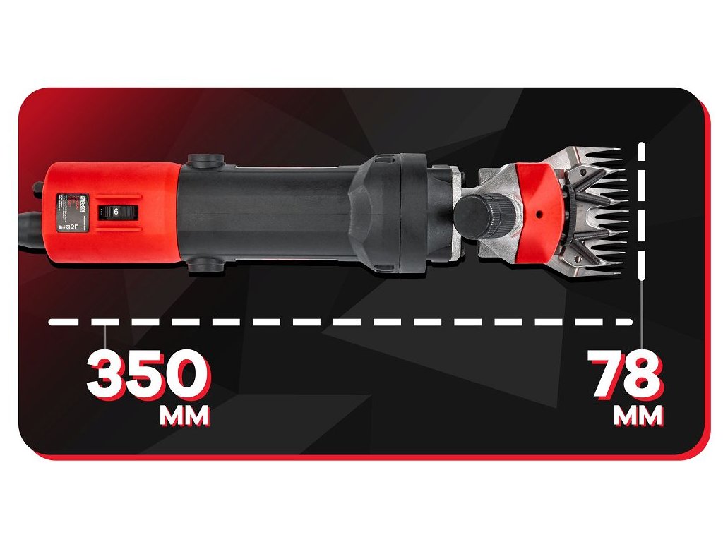 Erőteljes állatnyíró gép, sűrű és erős gyapjú, ló és szarvasmarha szőrzet hatékony ápolására. Edzett rozsdamentes acél pengékkel, nagy teljesítményű 600 W-os motorral és léghűtéssel felszerelve, sima és biztonságos vágást biztosít túlmelegedés nélkül. A hosszú, 5 méteres kábelnek és a praktikus nyomás- és fordulatszabályozásnak köszönhetően könnyen alkalmazkodik a különböző munkakörülményekhez.