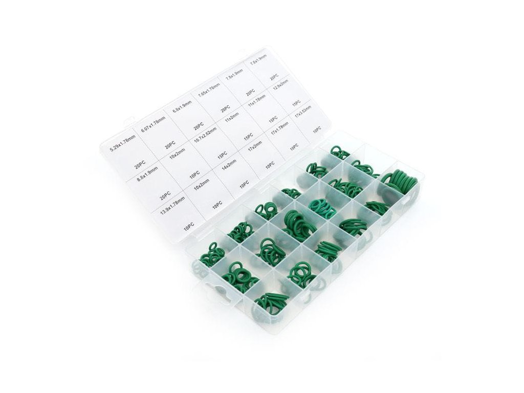 Teljes készlet egy műanyag konténerben található, ahol minden O-gyűrű méretének megvan a maga kijelölt helye.