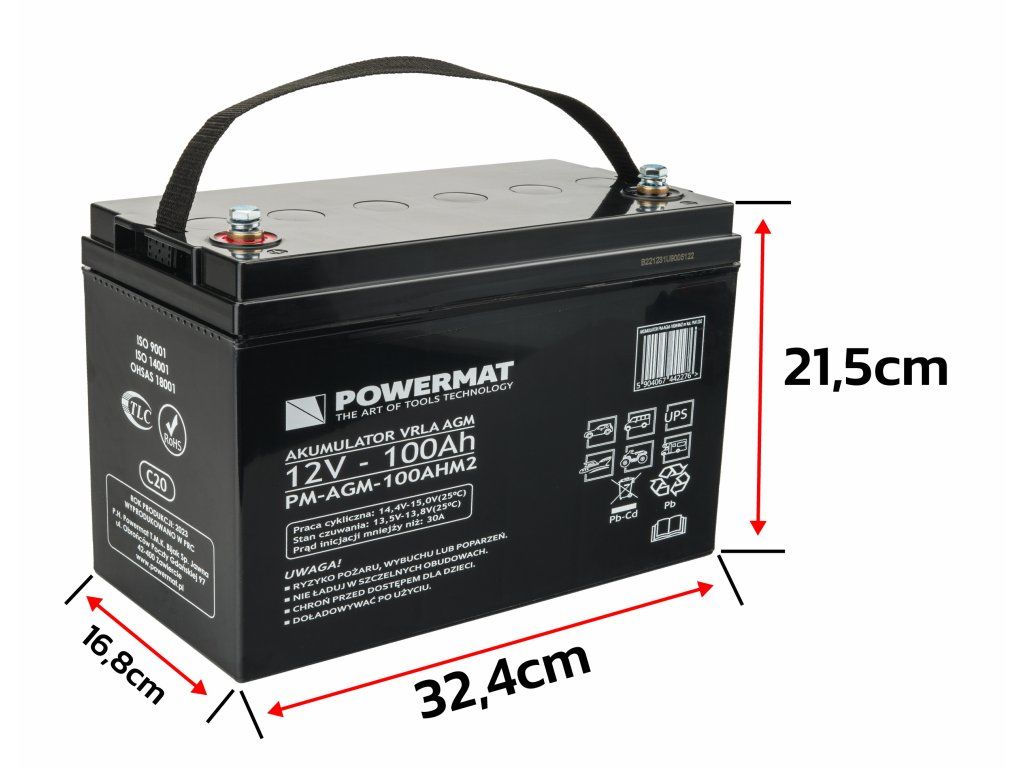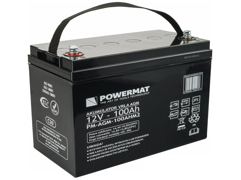 Olomu-kénsav akkumulátor POWERMAT VRLA AGM C20 / 12V / 100Ah (Gyártási dátum: 2023.01)