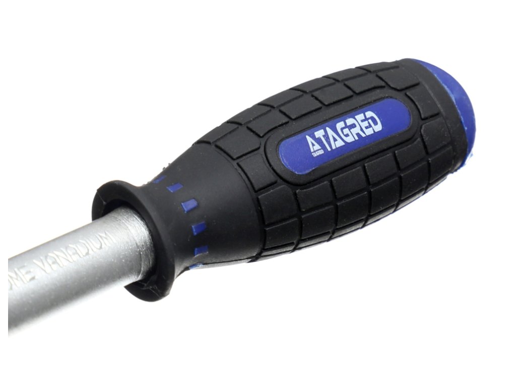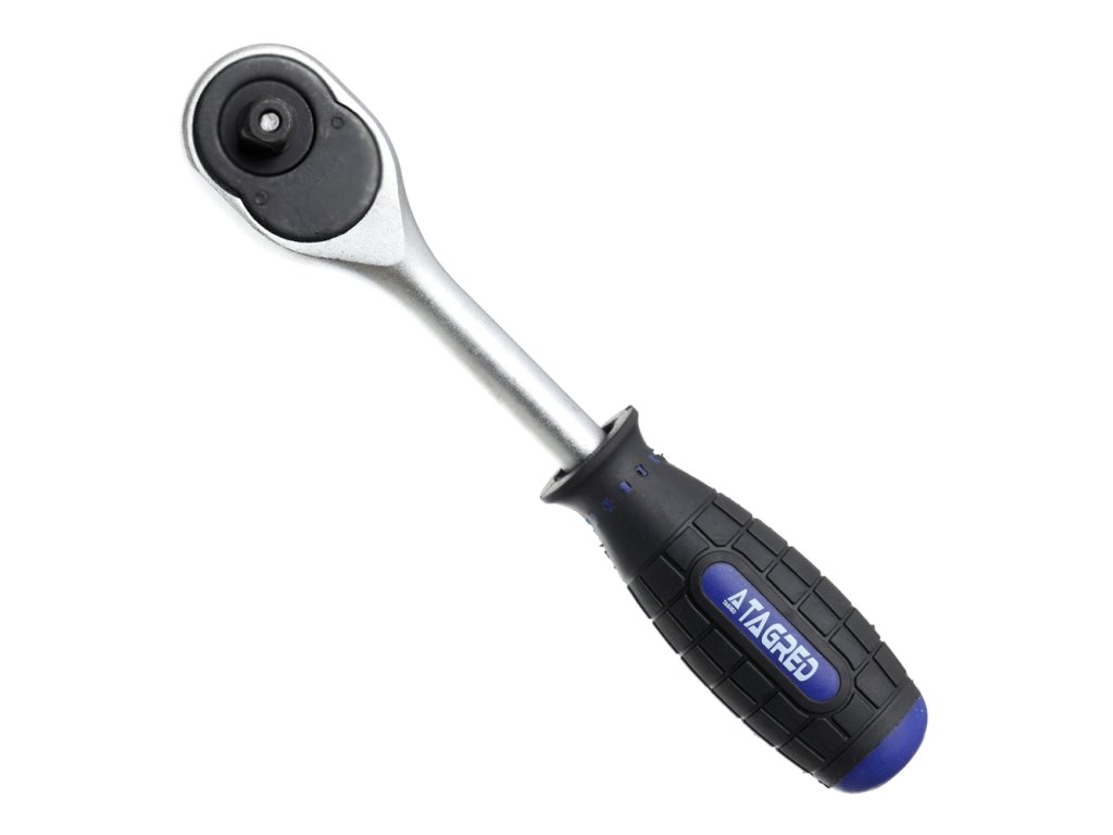 A ráccázó kulcs bordázott markolata, amely kiváló minőségű műanyagból készült, biztosítja a szilárd és kényelmes fogást használat közben. A selymes felület nemcsak az eszköz esztétikáját javítja, hanem megkönnyíti a tisztán tartását is.