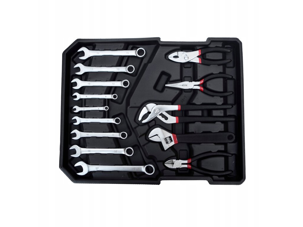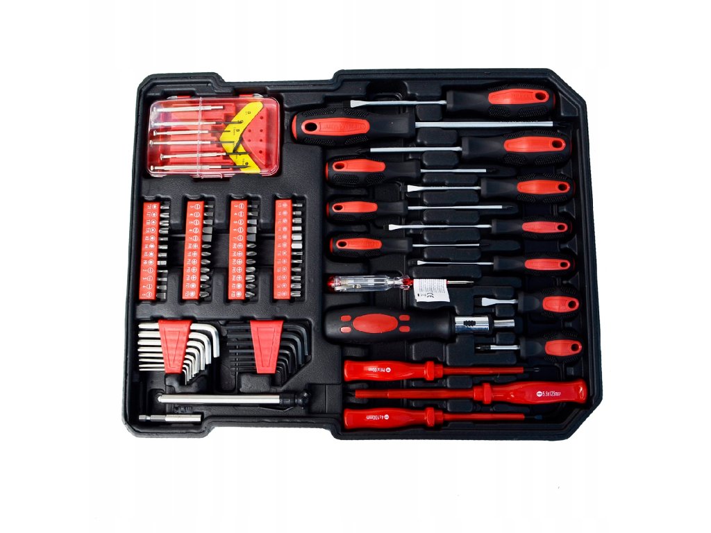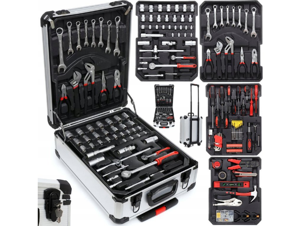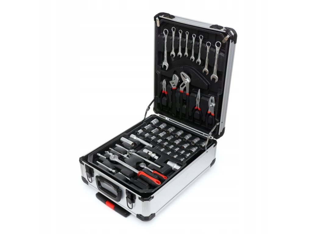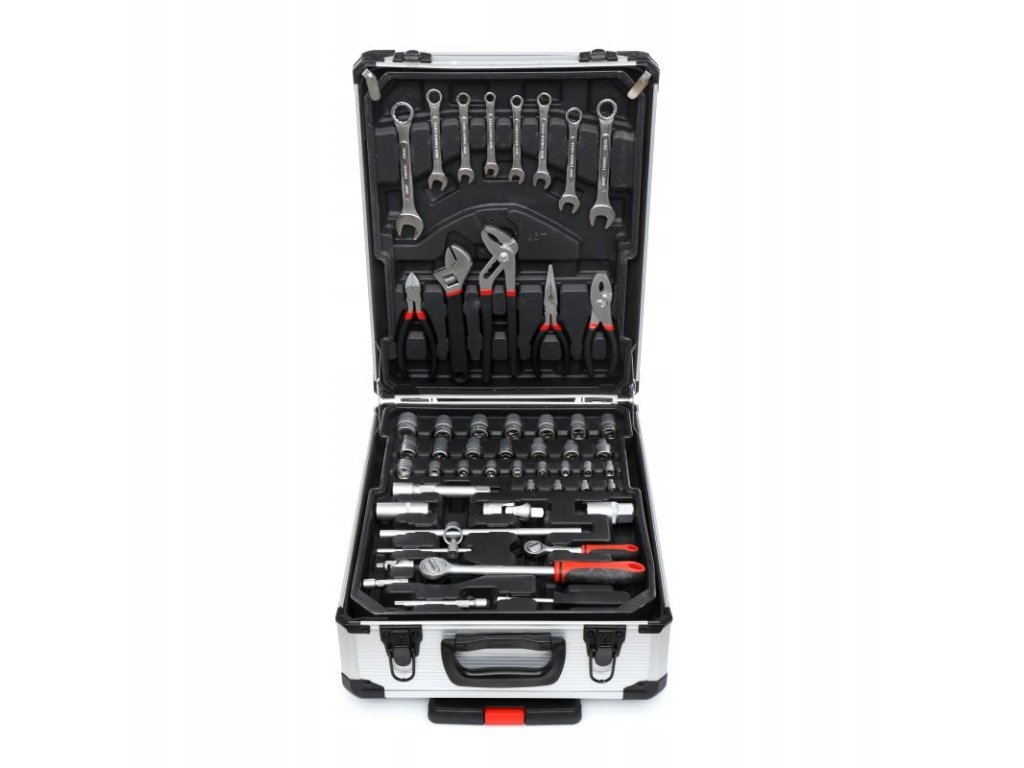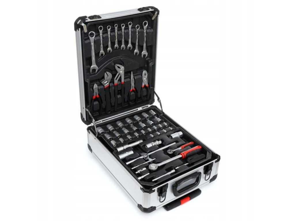 Szerszámkészlet 419 db alumínium táskában kiváló megoldás mindenkinek, aki szeretné, hogy minden alapvető eszköze rendszerezve és praktikus módon legyen tárolva. Ez a minőségi táska kerekekkel és dupla kihúzható fogantyúval rendelkezik, amely megkönnyíti a szállítást még teljes terhelés mellett is. A táska belsejében 4 kihúzható fiók található, amelyek széles eszközkínálatot tartalmaznak – a kulcsoktól és csavarhúzóktól kezdve a fogókig és egyéb tartozékokig.