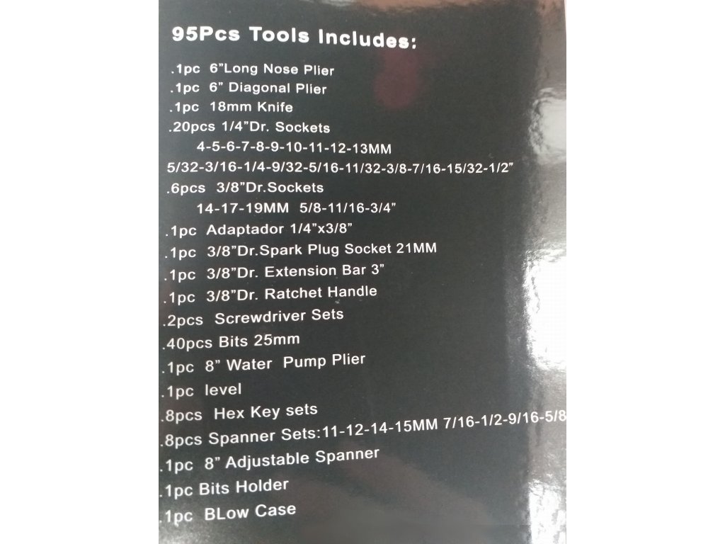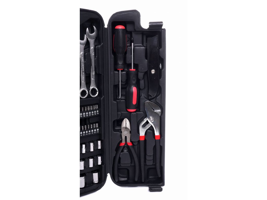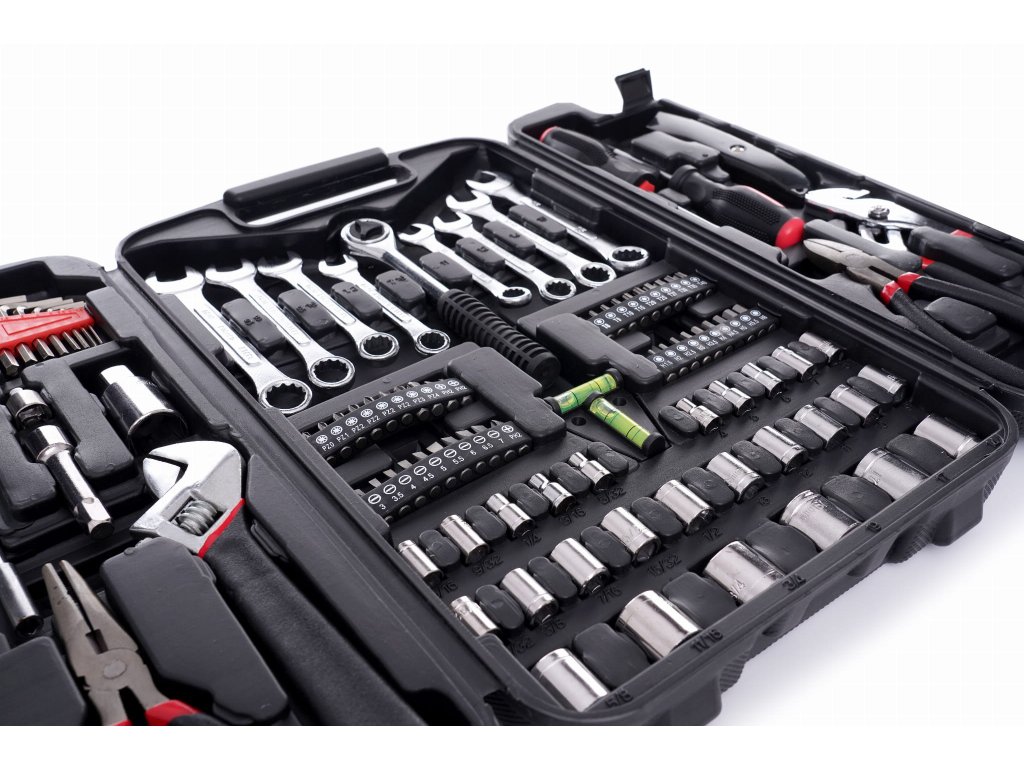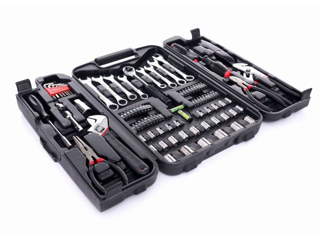 lapos kulcsok, dugókulcsok, ráčna, fogókészlet, szorítók, imbusz kulcsok, kés, valamint csavarhúzók és bitek.