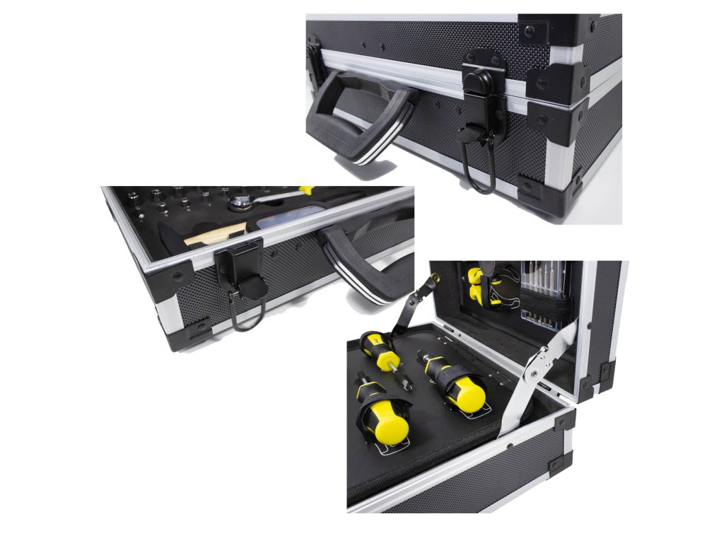 A táska erős és megbízható zárakkal van felszerelve, amelyek biztosítják a szerszámok biztonságos és egyszerű szállítását.